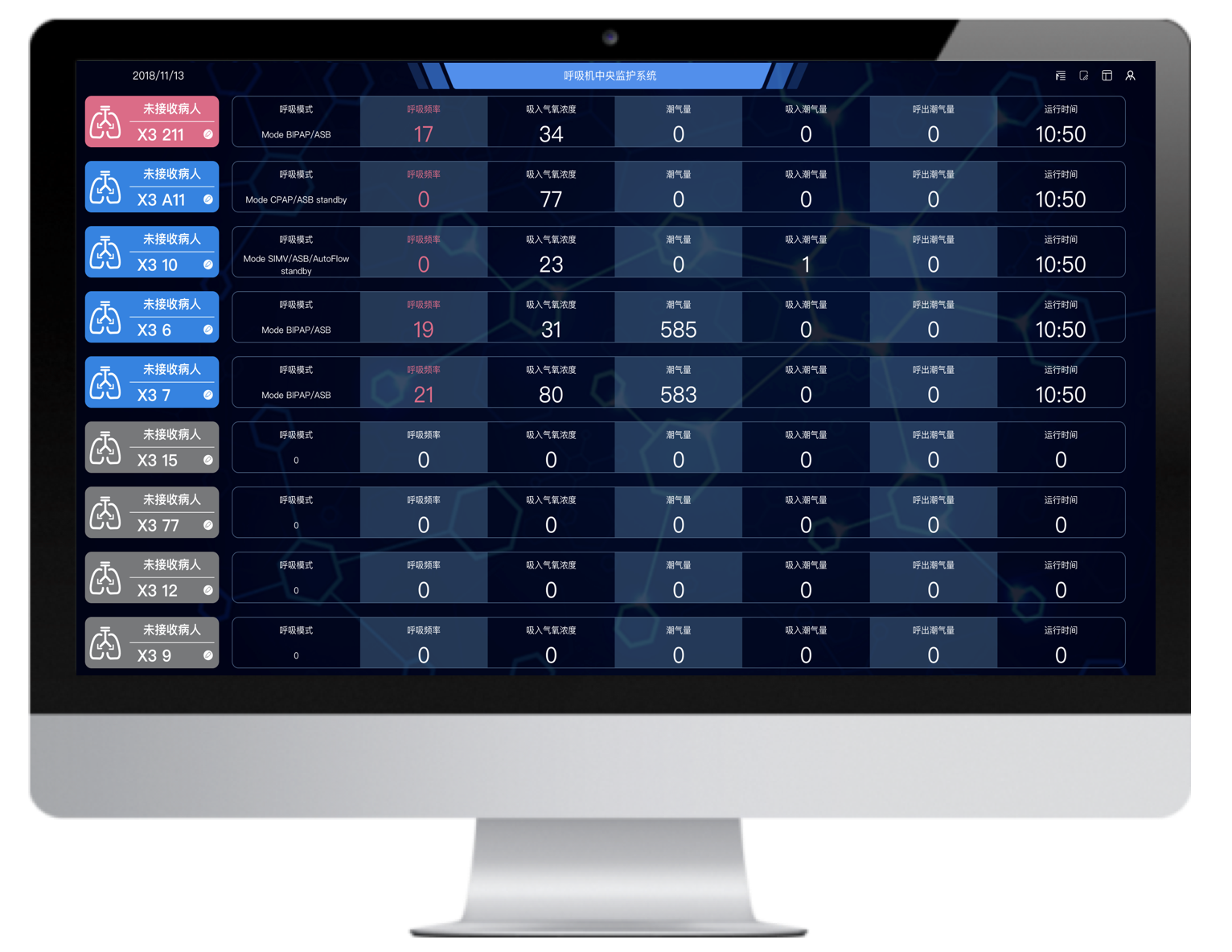 多臺不同品牌的有創(chuàng)呼吸機聯(lián)網(wǎng),并通過大屏實時集中呈現(xiàn)治療預設參數(shù)和監(jiān)測參數(shù),實現(xiàn)多臺集中監(jiān)測、集中管理和數(shù)據(jù)存儲。